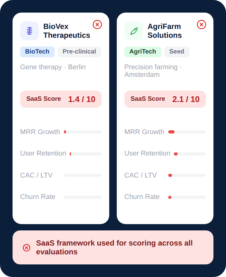 A BioTech and AgriTech startup are different, but scored against the same generic (SaaS) frameworks. Without stage-specific criteria. Without institutional rigor.